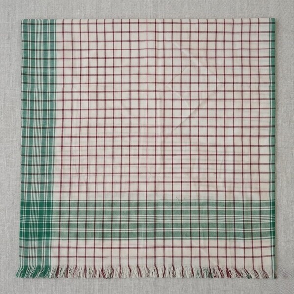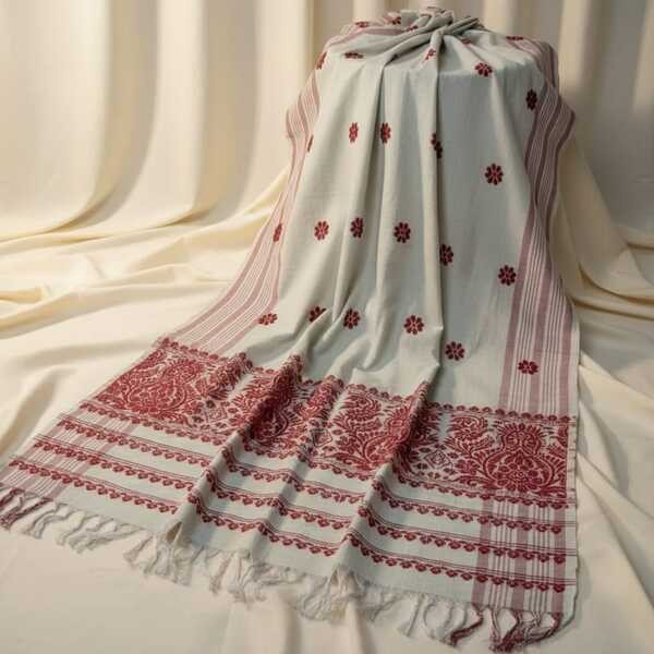 The Gamosa, a traditional handwoven cotton cloth from Assam, is a white rectangular piece with red or maroon borders and often features woven motifs, serving as a symbol of respect, hospitality, and cultural identity. Location : Assam, India