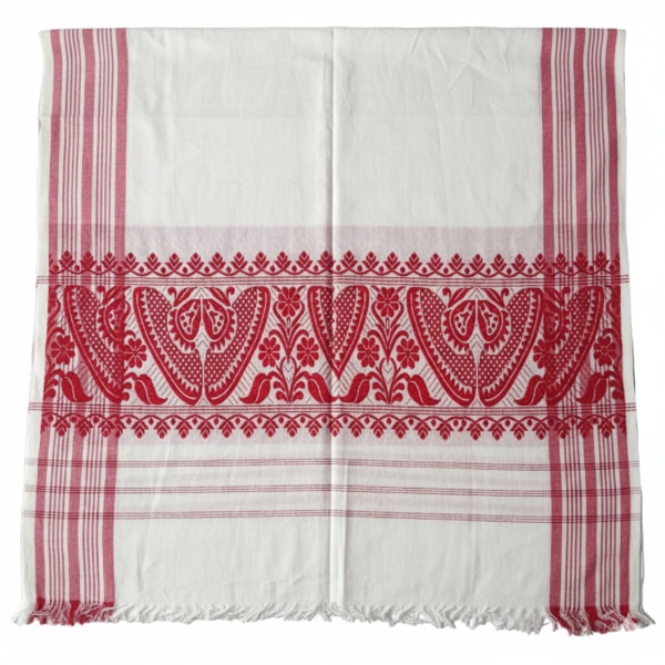 A both side fulam gamusa refers to a traditional Assamese gamusa (or gamosa) that features floral or fulam motifs woven on both sides, a design element that enhances the cultural significance and visual appeal of this traditional textile. Location : Assam, India