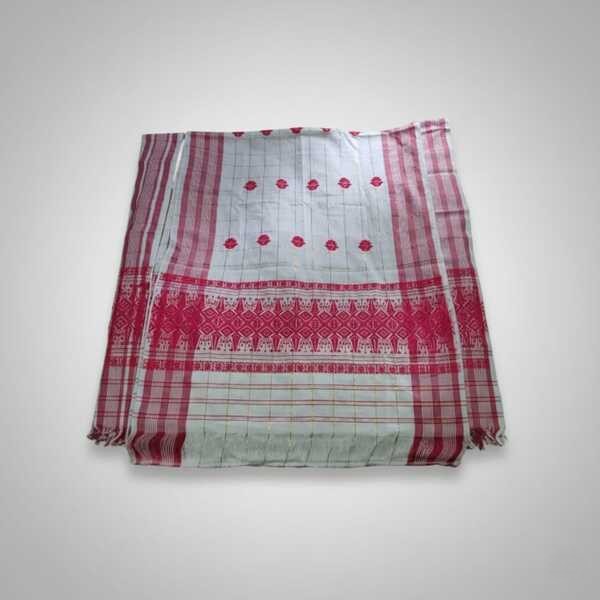 The Gamosa, a traditional handwoven cotton cloth from Assam, is a white rectangular piece with red or maroon borders and may feature decorative motifs, serving as a symbol of hospitality, friendship, and respect, and used in various cultural and religious ceremonies. Location : Assam, India