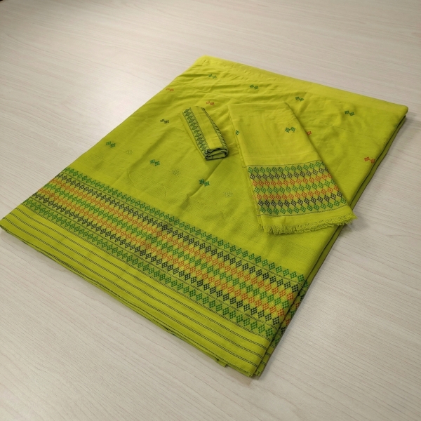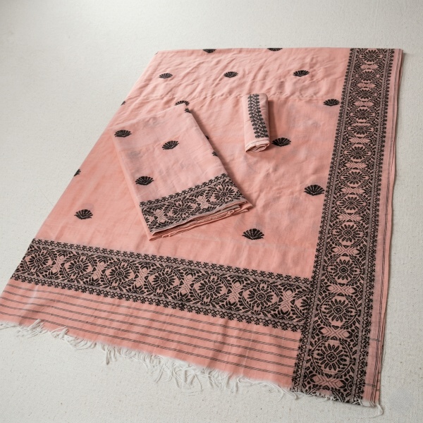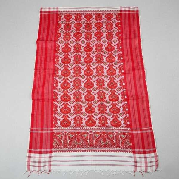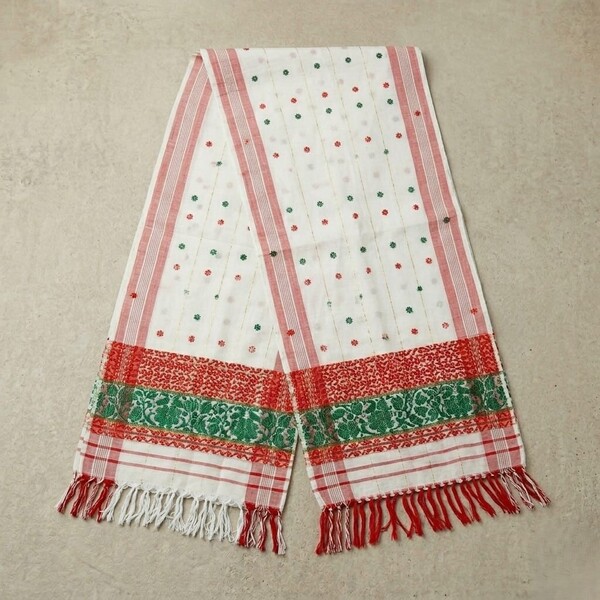 The Assamese Fulam Gamosa is a traditional handwoven rectangular cotton cloth from Assam, India, often used for various purposes. It is typically white with red borders and intricate floral or geometric designs woven into it. The Gamosa is a symbol of respect, hospitality, and cultural pride, used in ceremonies, as a gift, and for everyday use. Location : Assam, India