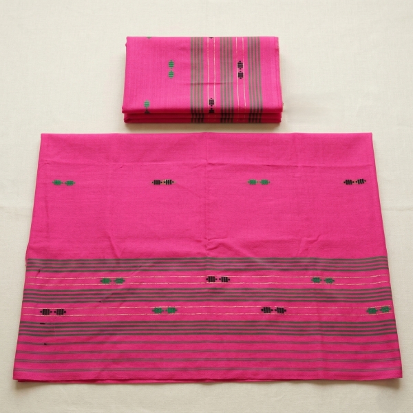 A cotton Mekhela Sador is a traditional two-piece garment worn by women in Assam, India. It consists of a mekhela (the bottom piece) and a sador (the upper piece). The mekhela is a wide, cylindrical piece of cloth draped around the waist and tucked in, often with a petticoat underneath. The sador is a long piece of fabric that is draped over the shoulder and tucked into the upper part of the mekhela. Location : Assam, India