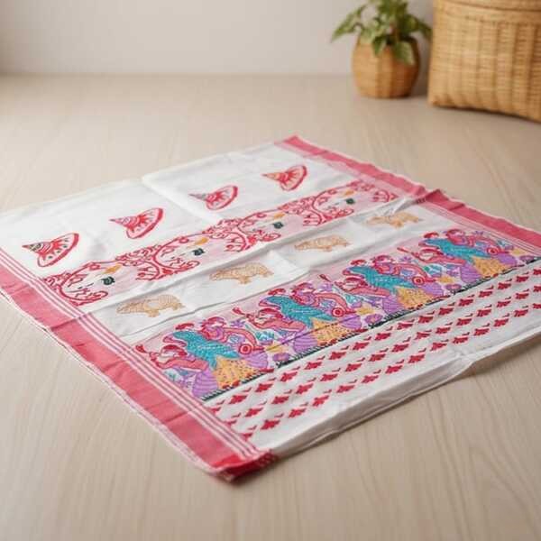 The Gamosa is a traditional Assamese handwoven cotton cloth, known for its cultural and symbolic significance. It is typically a rectangular piece of fabric, usually white, with red or maroon stripes on the borders, and sometimes features decorative motifs. The Gamosa can be used for various purposes, including wiping, head covering, or as a gift wrapper. It is a symbol of respect, hospitality, and friendship in Assamese culture. Location : Assam, India