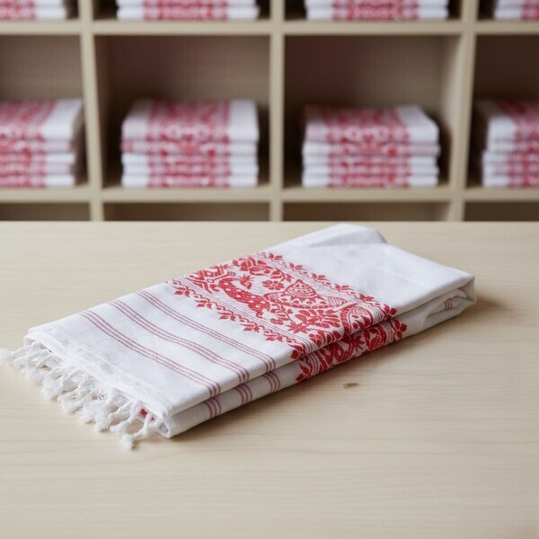 The Gamosa is a culturally significant, rectangular, handwoven cotton cloth from Assam, India. It is a symbol of hospitality, friendship, and respect, often used as a gift or to honor guests. Gamosas are typically white with red or maroon borders, and may feature decorative motifs. They can be used as a towel, handkerchief, head covering, or even a gift wrap. Location : Assam, India
